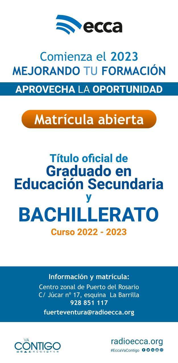 La oferta formativa de Radio ECCA para la obtención del título de Secundaria Obligatoria y Bachillerato se compone de una serie de módulos que están reconocidos y acreditados por la Consejería de Educación y Universidades del Gobierno de Canarias. El sistema modular proporciona una mayor flexibilidad, donde además el alumnado podrá contar con un apoyo constante a través de tutorías repartidas por toda la isla de Fuerteventura. Por otro lado, disponemos de un sistema de becas para aquellas personas que no puedan costear los estudios y también se valorará la formación académica previa para que el alumnado no parta de cero y pueda continuar sus estudios donde los dejó.
