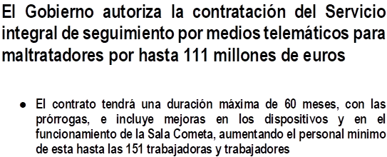 El Consejo de Ministros y Ministras ha aprobado en su reunión de hoy un acuerdo por el que se autoriza la contratación del servicio integral del sistema de seguimiento por medios telemáticos del cumplimiento de las medidas cautelares y penas de prohibición de aproximación en materia de violencia de género y de violencia sexual, por un valor estimado de hasta 111.100.438,80 euros.