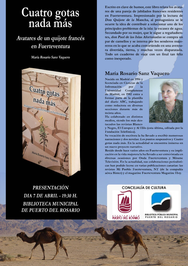 Los paisajes y molinos majoreros inspiraron a María Rosario Sanz Vaquero, periodista y escritora, a escribir su novela ‘Cuatro gotas nada más’ que este próximo jueves, 7 de abril, presentará al público en la Biblioteca municipal de Puerto del Rosario en un acto que tendrá lugar a las 19.30 horas.