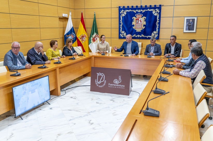 El presidente del Cabildo, Sergio Lloret López, junto a los vicepresidentes primero y segundo, Lola García y Claudio Gutiérrez, respectivamente, y el consejero de Comercio, Domingo Pérez, han acompañado hoy a los dirigentes de la nueva Federación de Asociaciones de Comerciantes de Fuerteventura (FECAFUER) en la presentación oficial de la entidad.