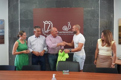 El Cabildo de Fuerteventura recibe al deportista Abel Mancilla antes de dar comienzo a su reto ‘Pisadas solidarias’ que llevará al atleta a recorrer mañana, sábado 9 de julio, la isla de norte a sur. El trayecto lo realizará caminando durante las 24 horas del día sin parar, partiendo desde Corralejo. Mansilla contará con un equipo de tres personas de apoyo, que se desplazarán desde Corralejo con él. Al acto de recepción asistió el presidente del Cabildo, Sergio Lloret, la vicepresidenta primera, Lola García, el consejero de Deportes, Claudio Gutiérrez y la consejera de Turismo, Jessica de León.