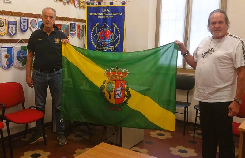 La sección italiana 17ª Delegación Friuli junto a Venecia reciben la gorra y enseña de la Policía Local de Antigua en un intercambio fraternal con la Asociación de Policía Internacional cuyo lema es Servo per Amikeco, servicio por la amistad.