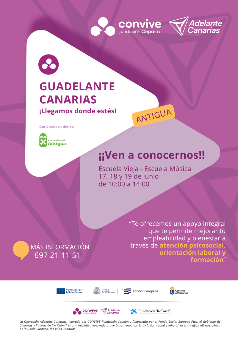 - El próximo martes 17 y hasta el jueves 19 de junio en horario de 10:00 a 14:00 horas, la Fundación Cepaim en las escuelas viejas en la plaza de Antigua, organiza una jornada formativa, abierta y gratuita, en el marco del proyecto Adelante Canarias, abriendo puertas para la igualdad y la inclusión.
