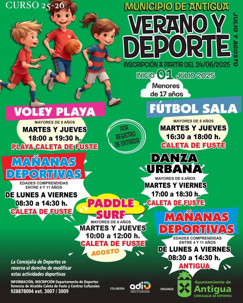 - Todas las actividades deportivas de verano en el Municipio de Antigua son de inscripción gratuita.