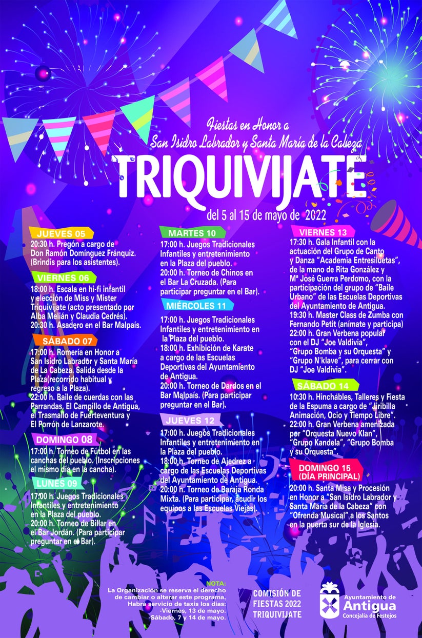 Las Fiestas de Triquivijate en Honor a San Isidro Labrador y Santa María de La Cabeza se celebran del 5 al 15 de mayo, retomando la tradicional Romería el sábado 7 con carros y carretas, sin faltar el espectáculo parrandero de las rondallas El Campillo de Antigua, el Trasmallo de Fuerteventura y el Porrón de Lanzarote.
