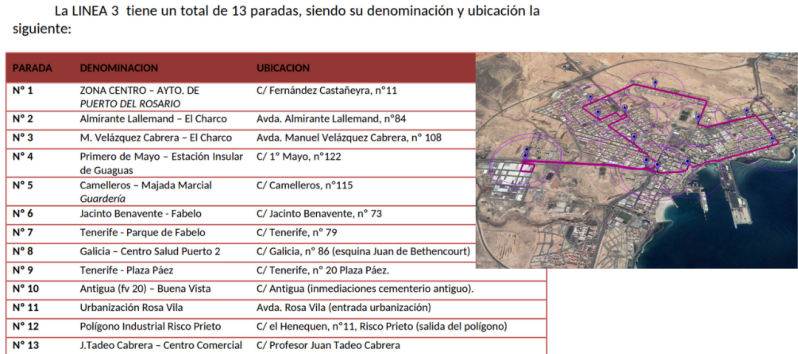 La LÍNEA 3, Cuenta con un total de 13 paradas, 8 paradas con marquesina compartida con la línea 2 y 5 paradas no coincidentes con la línea 2 en calle Galicia (Centro de Salud Puerto 2), fv 20, C/ Antigua (Buena Vista, frente al cementerio), Avda. Rosa Vila (entrada urbanización Rosa Vila), C/ el Henequen, Risco Prieto (salida del polígono) y C/Juan Tadeo Cabrera (Centro Comercial), con salida y fin en la “Zona Centro – calle Fernández Castañeyra” (Ayuntamiento de Puerto del Rosario).