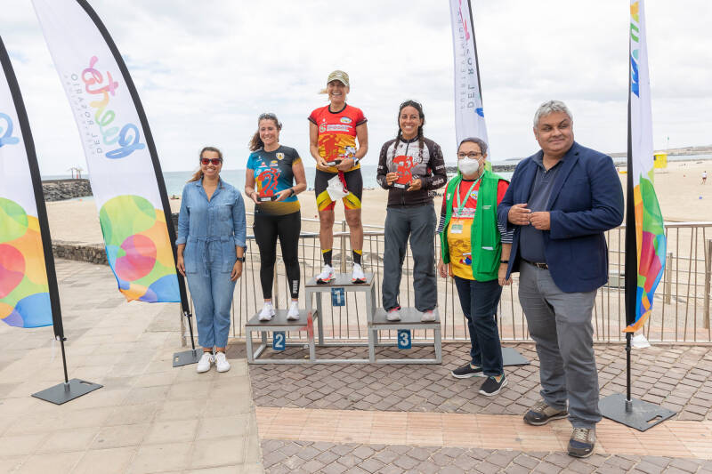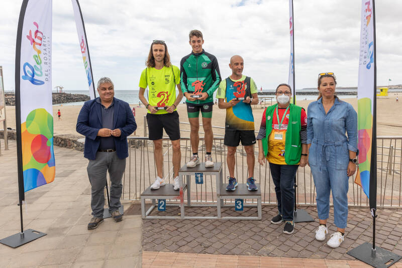 El alcalde del Ayuntamiento portuense, Juan Jiménez, junto a la concejala de Deportes y de Turismo, Sonia Álamo, y la concejala de Relaciones Institucionales, Peña Armas, arroparon en la salida a los participantes y acompañaron en el final a los ganadores y ganadoras para hacer entrega de los trofeos junto a los representantes del club deportivo Trotadunas y de la Asociación Española contra el cáncer con sede en Fuerteventura.