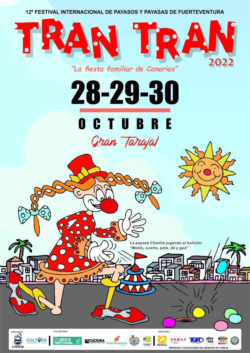 Las calles, el muelle, la avenida y plazas de Gran Tarajal se llenarán de risas y alegría con la llegada del Festival Internacional de Payasos y Payasas de Fuerteventura Tran Tran, que se celebrará en la localidad de Gran Tarajal del 28 al 30 de octubre.