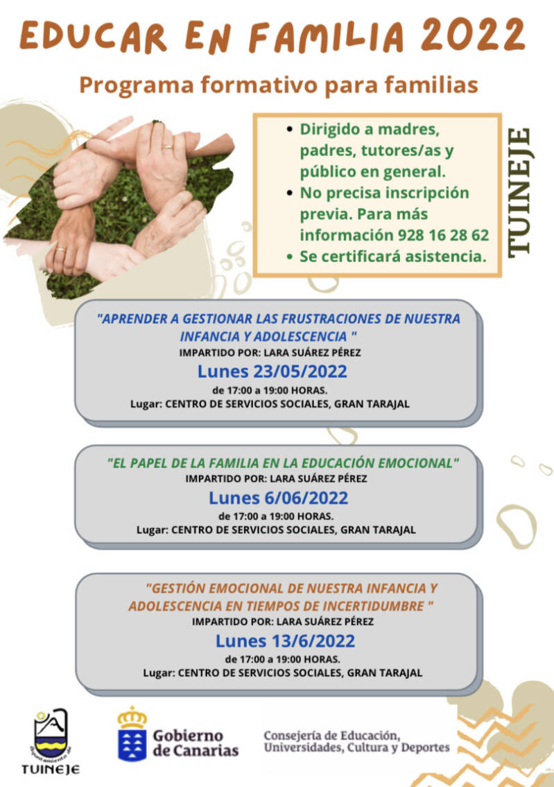 El Ayuntamiento de Tuineje, desde la concejalía de Servicios Sociales, ha puesto en marcha, un año más, el programa “Educar en Familia 2022”, que está organizado por la Consejería de Educación y Universidades del Gobierno de Canarias. Se trata de un programa que ofrece una formación presencial para padres, madres, tutores y público en general de los diferentes municipios y localidades de Canarias, con el objetivo de poder acercar al lugar de residencia de cada familia, las herramientas y estrategias necesarias para la educación de sus hijas e hijos.