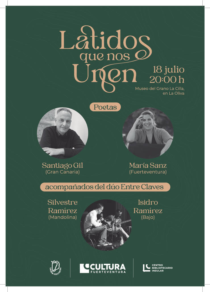 Los poemas de Santiago Gil (Gran Canaria) y María Sanz (Fuerteventura) aterrizan este jueves, 18 de julio, en un nuevo encuentro del ciclo ‘Latidos que nos unen’. Será a las 20.00 horas en el Museo del Grano, La Cilla, en La Oliva. Los poetas estarán acompañados por el dúo ‘Entre claves’, formado por los hermanos Ramírez: Isidro y Silvestre.