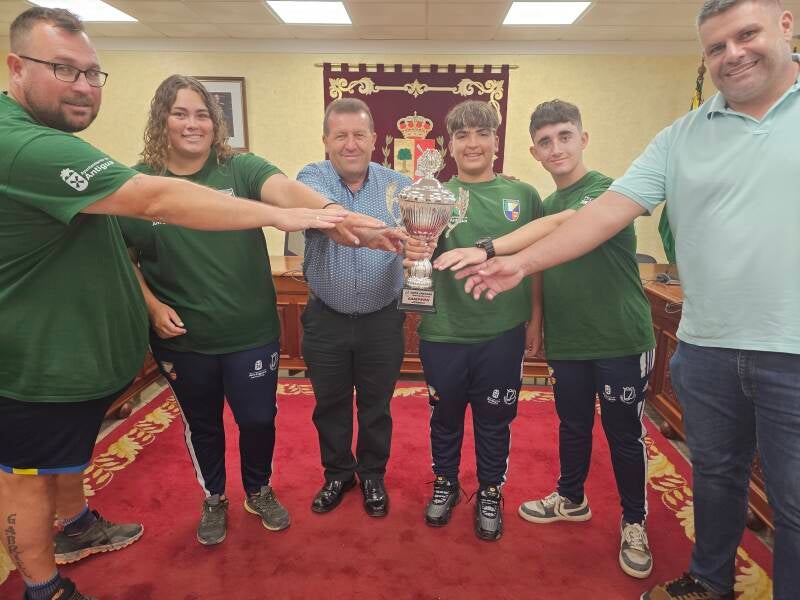 El alcalde de Antigua, Matías Peña García, y el concejal de Deportes, Samuel Torres Mesa, han recibido al equipo juvenil Los Cacharros de Bola Canaria, que el pasado fin de semana lograron proclamarse Campeones de la Copa Fuerteventura, tras superar a los equipos de Tindaya y Casillas del Ángel.