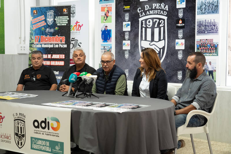 El Club Deportivo Peña de la Amistad ha presentado hoy su partido benéfico para recaudar juguetes para los niños y niñas más necesitados en el Día de Reyes. Un esperado encuentro solidario que se llevará a cabo el 17 de diciembre, a partir de las 19.00 horas, en el campo municipal de Los Pozos, con la participación del CD Peña de la Amistad femenino contra las viejas glorias del CD Corralejo.
