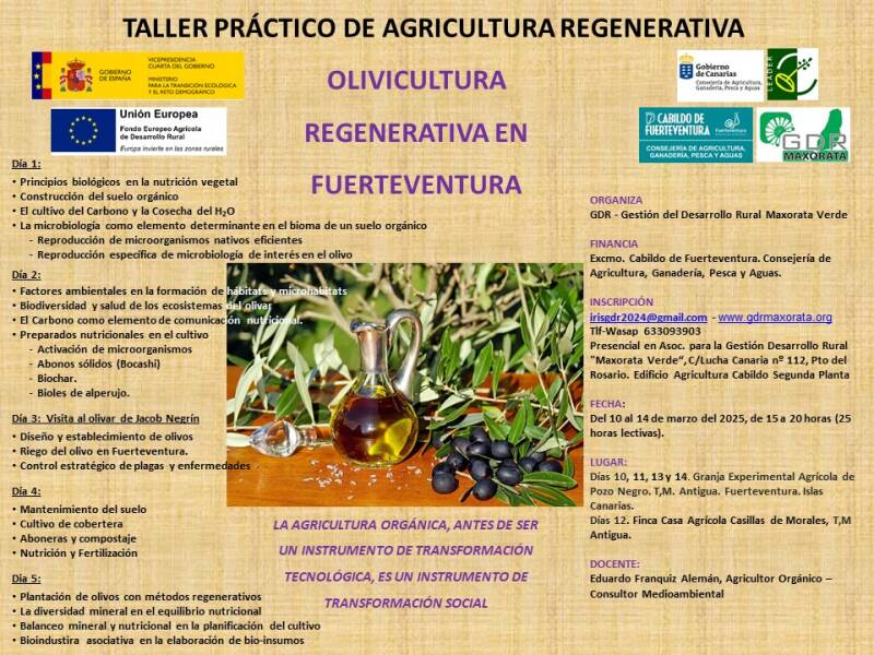 El Cabildo de Fuerteventura y Grupo de Desarrollo Rural (GDR) Maxorata Verde inicia su programa de formación 2025 en Fuerteventura con un taller práctico de agricultura regenerativa centrado en la olivicultura, que se llevará a cabo del 10 al 14 de marzo en la Granja Experimental Agrícola de Pozo Negro y en la Finca Casa Agrícola Casillas de Morales, con un total de 25 horas lectivas.