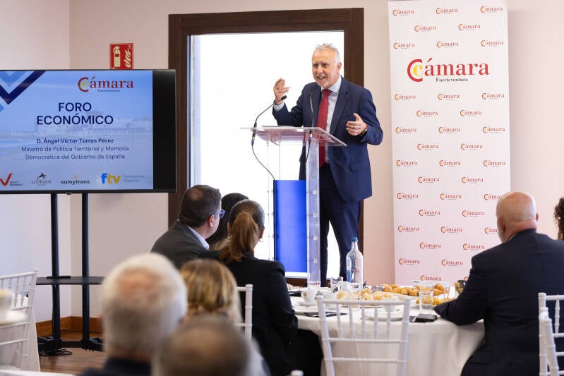 Puerto del Rosario, 3 de marzo de 2025.- La Cámara de Comercio de Fuerteventura organiza su segundo foro económico tras el éxito del primer encuentro organizado el día 18 de febrero. Este encuentro ha sido liderado por el ministro de Política Territorial y Memoria Democrática, D. Ángel Víctor Torres, que inicia su intervención con un discurso en el que explica las líneas de trabajo del ministerio.